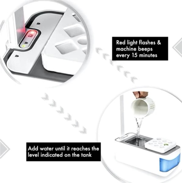 3️⃣Should red light is flashing, refill the water tank up to the scale as indicated.